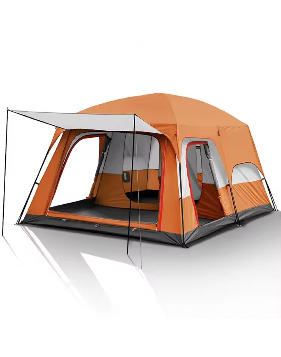This large family marquee tent is designed for 5-12 people, featuring a two-bedroom and one-living room structure. Made of waterproof Oxford cloth with an outside waterproof index exceeding 3000mm, it ensures durability and weather resistance. The tent is available in multiple colors including green, sky blue, plum, chocolate, and customized options. Its quick automatic opening design and double-layer structure make it suitable for all seasons, providing convenience and comfort for outdoor camping.